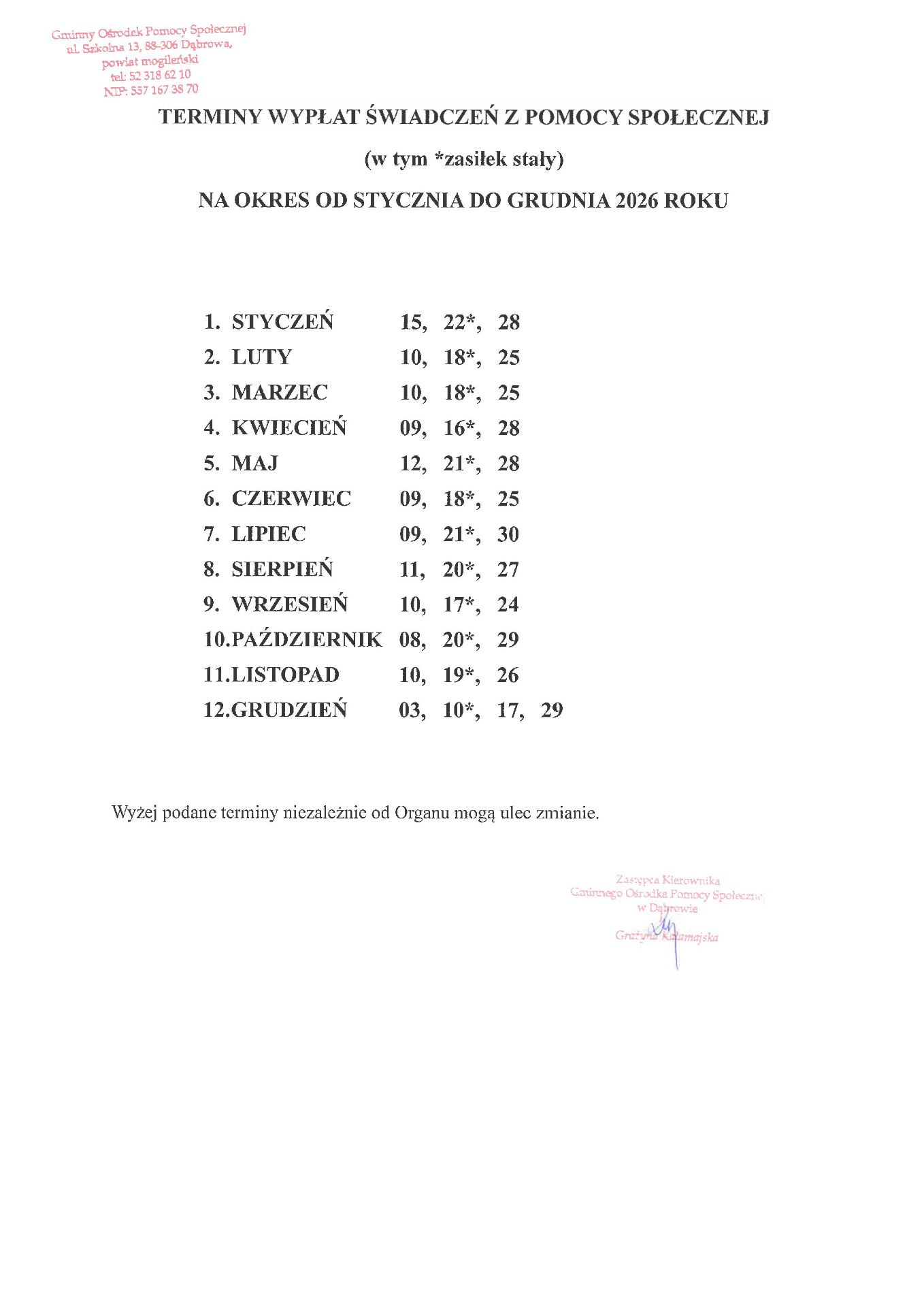 Bogna Wojtal) - Skopiowanie wiadomości - Terminy wypłat świadczeń z pomocy społecznej w 2026 roku (Dokument opublikowany)